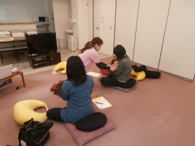 実際にUさん、Mさんのおっぱいチェックをしながら 乳頭ケアの力の入れ具合をお伝えしました。 お二人とも乳頭がやや硬めで、 『結構圧をかけてもいいんですねぇ~』 『産院でのクラスで聴いていたんだけれど、実際にしてみてよくわかりました。』 とのこと。 他には、授乳クッションの使い方ですね。 実際に2700~2900gの赤ちゃん人形を使って 授乳態勢をとります。イメージトレーニング大事ですね。